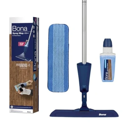 LIGHTWEIGHT: The Bona Spray Mop Air is an all-in-one solution, especially suitable for smaller households. The lightweight design enables easy maneuverability and reduces strain, even in corners and narrow spaces. Perfect for both quick and thorough cleaning, since it keeps your floors spotless with minimal effort. COMPACT: Traditional mops are bulky, ineffective and leave behind residues while cluttering your storage space. The Bona Spray Mop Air is tailored to meet the needs of modern homes. With a handy hook for hanging and the option to disassemble for compact storage, this mop is as practical as it is efficient. REFILLABLE BOTTLE: Bottle of 500 ml ensures precise application and easy use. The spray dispenses the perfect amount of the waterbased, pH-balanced formula that is certified by GREENGUARD Gold for healthier indoor air. It is residue-free, fast-drying and gently removing dirt and grime. REUSABLE MICROFIBRE PAD: Especially developed for use on wood floors. It's patented dual-zone design removes 99% of bacteria ensuring a gentle, thorough clean. The pad is made from 90% recycled material and is reusable and washable up to 500 times. KIT INCLUDES: 1xBona Spray Mop Air, 1xPrefilled Bona Wood Floor Cleaner Liquid bottle 500 ml and 1xBona Microfibre Cleaning Mop Pad. The compact system provides an effective solution for those seeking both efficiency and simplicity in their cleaning routine - just spray and mop!