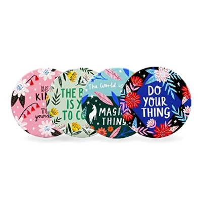 Officially licensed Bonbi Forest merchandise by Shruti Designs Lovely set of 4 cork-backed ceramic coasters Each coaster features a floral illustration and positive quote 11 (h) x 11 (w) x 3.5 (d) cm Wipe clean only