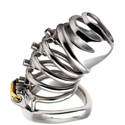 High quality 304 stainless steel with a chrome finish, Not nickel chrome plated like most other available on this site. High quality metal work, no weld spots, rough edges or cheap fabrication Armed with adjustable pains screws, you will be certain to know your predicament Super-strong cage , one of the best available on the market! See images for measurements Unique hidden style lock - discrete, secure and wont catch on clothing ergonomic comfort style Back with a diameter of 45 mm