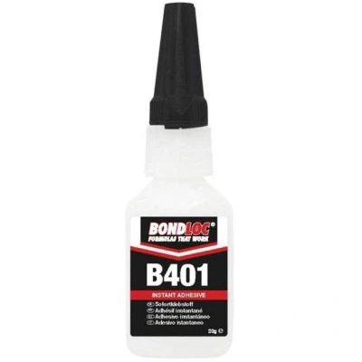 General description Bondloc B401 is a medium viscosity cyanoacrylate adhesive designed for bonding a wide range of materials including metals, plastics, wood, ceramics, rubber, leather, cardboard, and glass. It cures quickly through a reaction with moisture on the surface, forming a strong bond in seconds, making it ideal for small parts and applications requiring precise, fast bonding. The adhesive is clear and colorless, and its gelled variants allow for curing in wider gaps and on vertical surfaces. Technical specifications Type: Medium viscosity cyanoacrylate Appearance: Clear, colorless liquid Specific Gravity at 25°C: 1.06 g/cm³ Shelf life: 12 months unopened Viscosity at 25°C: 90 - 120 mPa·s Size: 20g Installation Ensure surfaces are clean, dry, and free of grease or dust. Apply a small amount of adhesive to one surface. Press surfaces together firmly within seconds of application. Hold or clamp if necessary until the bond sets. Usage Use in well-ventilated areas. Apply