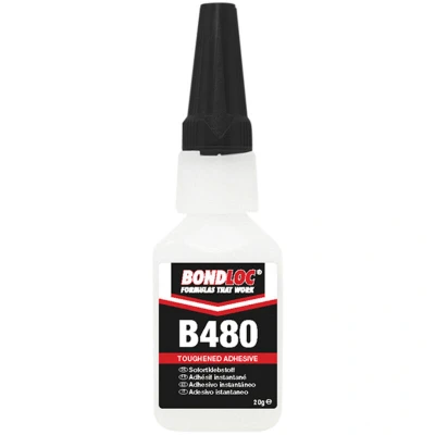 General description Bondloc B480 is a black rubber-toughened cyanoacrylate adhesive that provides a strong, durable bond on various materials including metals, plastics, wood, ceramics, rubber, leather, cardboard, and glass. This adhesive cures quickly through reaction with moisture present on the surfaces to be bonded, making it ideal for small parts and quick repairs. Technical specifications Type: Medium viscosity cyanoacrylate Appearance: Black opaque liquid Base: Ethyl cyanoacrylate Specific gravity at 25°C: 1.06 g/cm³ Viscosity at 25°C: 350 - 450 mPa·s Shelf life: 6 months unopened Size: 20g Installation Apply a small amount of adhesive to one surface. Press surfaces together firmly within seconds. Ensure close-fitting joints for optimal bonding. Usage Use on clean, dry surfaces for best results. Allow the adhesive to cure for a few seconds to minutes depending on the application. Suitable for small parts and quick repairs. Other information