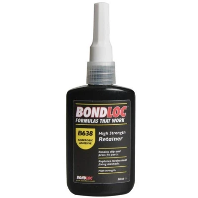 General description Bondloc B638 High Strength Retaining Compound is specifically designed to provide high strength retention under cyclic loading. This compound is ideal for bonding cylindrical parts and components, ensuring reliable retention without fatigue, making it suitable for structural applications such as keys, splines, and close-tolerance tubing. Technical specifications Resin: Urethane Acrylate Color: Green Fixture Speed without Activator: 5 minutes Fixture Speed with Activator: less than 5 minutes Viscosity: 2500 cps Gap Fill: up to 0.2 mm Flash Point: greater than 85°C Shelf Life: minimum 12 months Specific Gravity: 1.08 Max Operating Temperature: -55°C to +150°C Full Cure Time: 24 hours Static Shear Strength: 30 N/mm² Compatibility and accessories This compound is suitable for use with cylindrical parts, keys, splines, and structural tubing that require a close tolerance fit. Installation Apply the product to clean, dry surfaces to be bonded. Allow fixture time: 5