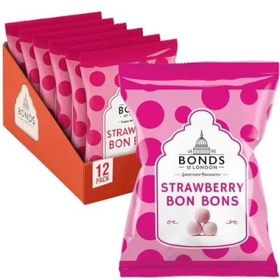 FLAVOURFUL: Delight in the timeless taste of juicy strawberry wrapped in a chewy, sugar-dusted bon bon—pure retro indulgence! SUGAR DUSTED: Sugar dusted, chewy sweets bursting with delicious strawberry flavour for a trip down memory lane TRADITIONAL TREATS: Retro traditional snacks made with no artificial colours or flavours, vegetarian-friendly and full of nostalgia! MULTIPACK VALUE: Enjoy 12 packs at once – perfect for sharing or stocking up on sweet treats for the whole family to enjoy BRITISH CONFECTIONERY HERITAGE: Crafted by Bonds of London, a trusted name in UK sweets since 1895—quality and tradition in every bag!