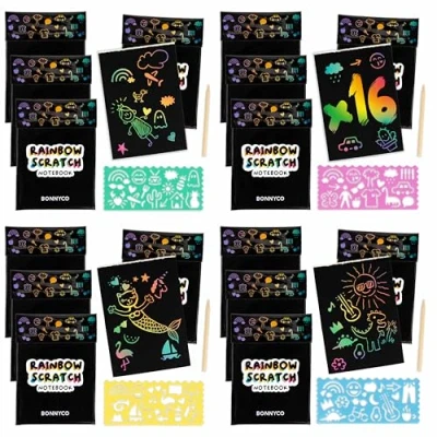 BONNYCO Rainbow Scratch Art for Kids, 16 Sets with Notebook, Stencil and Wooden Stylus. Party Bag Fillers Classroom Prizes Favours. End of Term Gifts Ages 3 to 12