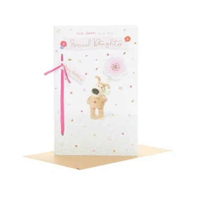 BIRTHDAY CARD - Make any birthday extra special with a thoughtful unique birthday card. A simple yet meaningful way to spread joy and celebration, whatever the age or occasion! DESIGN - Perfect for a special Daughter, this cute birthday card features Boofle holding a 3D flower. It's printed on premium quality board and finished with gold foil details, a raffia bow and tag. GIFTS FOR WOMEN - Make her smile with a thoughtful card. From birthday cards to thank you cards, our range offers something for every occasion, showing her how much you care with just the right words. SIZE - This card measures 171 x 260 mm, ample space for a personal message, and a perfect size for displaying as a keepsake in your home. HIGH QUALITY & SUSTAINABLE - Our products are crafted from high-quality material, ensuring durability and a premium feel. We use materials from responsibly managed forests and controlled sources, certified by the Forest Stewardship Council (FSC). BOOFLE - Hi, I'm Boofle! Made with 100% love and cuddles (oh, and lots of wool and a button!), I've been spreading warmth and joy since 2008. From greeting cards to cosy pyjamas, my adventures have brought smiles to millions.