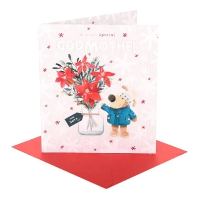 CHRISTMAS CARD - Send warm wishes this festive season with a Christmas card for friends, family, or colleagues. Whether traditional or funny, a heartfelt message will make their holiday even brighter. DESIGN - Wish an speical godmother a brilliant Christmas with this cute Boofle card, printed on premium quality board with silver foil details. GIFTS FOR WOMEN - Make her smile with a thoughtful card. From birthday cards to thank you cards, our range offers something for every occasion, showing her how much you care with just the right words. SIZE - This card measures 18.4 x 15.9 cm, ample space for a personal message, and a perfect size for displaying as a keepsake in your home. HIGH QUALITY & SUSTAINABLE - Our products are crafted from high-quality material, ensuring durability and a premium feel. We use materials from responsibly managed forests and controlled sources, certified by the Forest Stewardship Council (FSC).