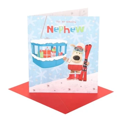 A Thoughtful Gift For Nephew - This cheerful Christmas card for your nephew conveys festive joy, making him feel special and delighted during the Christmas season. Festive Adorable Design - This delightful Boofle Christmas card features a skiing design with a cable car of gifts, set against a snowy backdrop, finished with silver foil, and includes a red envelope. Joyful, Heartfelt Christmas Wishes! - With its cheerful message, "For an amazing nephew, hope you have a brilliant Christmas! With lots of love xxx," this collectable greeting card is ideal for expressing your festive wishes to him. Exceptional Quality, Thoughtful Design - This collectable greeting card is foiled, unwrapped, and thoughtfully designed as part of the popular Boofle range — the cute knitted dog loved by all the family. Each greeting card measures 16 x 18 x 0.5 centimetres or 6.25 x 7.1 x 0.25 inches and comes with a red envelope. Eco-Friendly, Letterbox Friendly, Thoughtfully Packaged - This product comes in packaging-free form, fits through your letterbox, and can be mailed with a Standard Letter Stamp. It is made from FSC-Certified, sustainably sourced card.