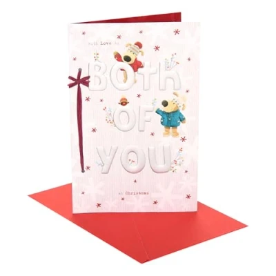 Cheerful Card For Loved Ones - This cheerful Christmas greeting card is perfect for couples, conveying warm wishes and delight, making it an ideal gift to express joy for both recipients. Festive Artistic Design - Delight in this Boofle collectable Christmas card, featuring an adorable design with embossed silver foil lettering and a charming red raffia ribbon, perfect for celebrating togetherness. Joyful Wishes For A Special Celebration - With its cheerful caption, "With love to both of you at Christmas! Wishing you both a truly special Christmas filled with lots and lots of love! xxx," this collectable greeting card is a wonderful way to express your joy and warmth to them. Exquisite, Thoughtful, Collectable Design - This collectable greeting card is beautifully embellished, foiled, and thoughtfully designed as part of the popular Boofle range — the cute knitted dog loved by all the family. Each greeting card measures 15 x 23 x 0.5 centimetres or 6 x 9 x 0.25 inches and comes presented with a red envelope. Eco-Friendly, Postal Safe, Thoughtfully Packaged - This product comes in packaging-free form, fits through your letterbox, and can be mailed with a Standard Letter Stamp. It is made from FSC-Certified, sustainably sourced card.