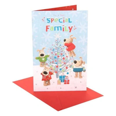 Heartfelt Card For Family Togetherness - This heartfelt Christmas greeting card is a thoughtful gesture for a special family, designed to express love and delight, making the family feel special during the festive season. Colourful Artistic Design - Celebrate the season with this delightful Boofle Christmas card! Featuring a charming family of Boofles in festive jumpers and silver foil, it comes with a red envelope. Heartfelt Wishes For A Joyful Christmas - With its heartfelt message, "Wishing a very happy Christmas to a truly special family! Sending lots of love xxx," this collectable greeting card is a wonderful way to express your thoughtfulness to them. Exquisite, Embossed, Thoughtfully Crafted - This collectable greeting card is embossed, foiled, and thoughtfully designed as part of the popular Boofle range — the cute knitted dog loved by all the family. Each greeting card measures 15 x 23 x 0.5 centimetres or 6 x 9 x 0.25 inches and comes with a red envelope. Eco-Friendly, Letterbox Friendly, Thoughtfully Packaged - This product comes in packaging-free form, fits through your letterbox, and can be mailed with a Standard Letter Stamp. It is made from FSC-Certified, sustainably sourced card.