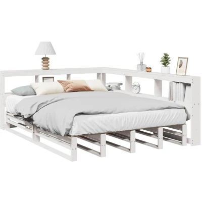 ManoManoGeneral description Get a better restful night's sleep with this stylish bookcase bed! It makes a welcoming addition to any bedroom, combining functionality with rustic charm. Technical specifications Colour: White Material: Solid pinewood Overall dimensions: 208.5 x 153.5 x 80 cm (L x W x H) Bed frame dimensions: 190 x 135 x 25.5 cm (L x W x H) Suitable mattress size: 135 x 190 cm (W x L) (mattress not included) With slatted base Bookcase headboard dimensions: 208.5 x 153.5 x 80 cm (L x W x H) Suitable for mattress width: 135 cm Assembly required: Yes Compatibility and accessories A mattress is not included with this bed. Various selections of mattresses are available in our shop. Installation Flexible assembly options allow you to place the long side of the headboard on either the left or right side to match your bedroom space. Usage The headboard features built-in storage to keep books, decorative items, and essentials organized and within reach. This L-shaped headboard fits snugly