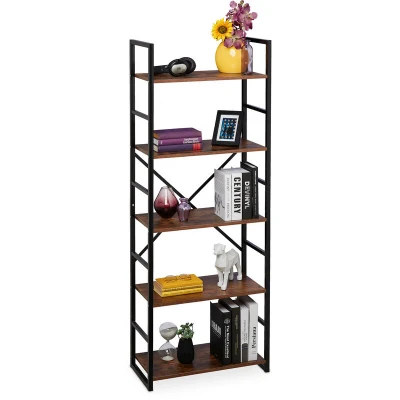 General description This Relaxdays bookcase features a trendy industrial design, combining dark brown wood with a sturdy black metal frame. It offers ample storage space across five levels, making it ideal for organizing books, folders, magazines, and displaying decorations or plants. Its open design ensures that stored items are always within reach, making it a versatile addition to any living room, bedroom, study, or kitchen. Technical specifications Dimensions H x W x D: approx. 158.5 x 60 x 30 cm Dimensions per shelf W x D: approx. 56 x 30 cm Distance between shelves: approx. 32 cm Max. load: approx. 50 kg Weight: approx. 12 kg Material: MDF, iron Colour: Brown, black Installation Included in delivery: 1x bookcase in individual parts Assembly instructions and material are provided