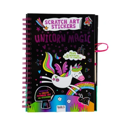 Calling all Unicorn lovers! This Scratch Art Stickers book is packed full of magical unicorn and rainbow scratch art with an enchanting story to complete. Perfect for entertaining the kids and adding some magic to their day. Complete with a wooden scratching tool attached to scratch and create rainbow art and stickers.. 1 x Unicorn Magic Scratch Art Stickers Book. H 26cm x W 18cm (approx). Scratch to create rainbow art and stickers. Plus an enhanting story to complete