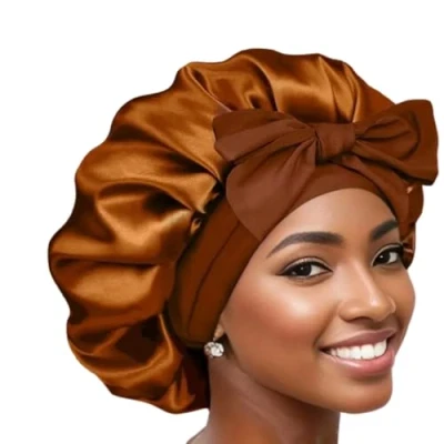 Boolavard Silk Bonnet for Sleeping Women Satin Double Layer Lined Hair with Tie Band Curly (UK, Alpha, One Size, Light Brown)