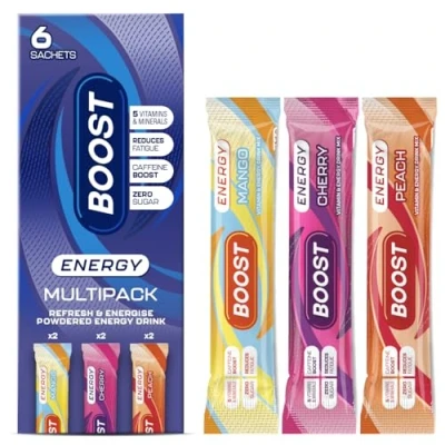 There’s a BOOST for That: Need to stay switched on? BOOST Energy combines caffeine, B-vitamins, minerals and zinc to help you feel sharp and ready, whatever your day throws at you The ultimate energy and hydration drink to suit any lifestyle Try ou Zero Sugar Energy Blend with Caffeine: Full flavour, no sugar A tasty way to hydrate without the crash Our energy and hydration powder is formulated with key vitamins, minerals and zinc to replace what’s lost during a busy day or workout, helping y Full-On Flavour: Choose from our variety of 3x delicious flavours, all bursting with energising freshness Simply mix with water for an instant hydration hit that fits right into your day-to-day Convenient and Portable: Ready to go when you are BOOST Energy powder comes in 2x convenient pack sizes, our 30 serving pouch and our on-the-go energy powder sachets BOOST Energy fits your lifestyle, so you’re never caught without refreshing energy Big flavour Bold energy BOOST is your go-to energy and hydration powder The ultimate flavoured energy boost for your daily recovery