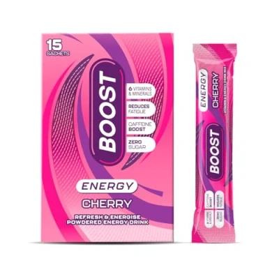There’s a BOOST for That: Need to stay switched on? BOOST Energy combines caffeine, B-vitamins, minerals and zinc to help you feel sharp and ready, whatever your day throws at you. The ultimate energy and hydration drink to suit any lifestyle. Zero Sugar Energy Blend with Caffeine: Full flavour, no sugar. A tasty way to hydrate without the crash. Our energy and hydration powder is formulated with key vitamins, minerals and zinc to replace what’s lost during a busy day or workout, helping you feel energised and refreshed anytime Full-on Flavour with plenty of Energy: BOOST Energy Cherry serves up bold cherry taste with a caffeine lift and hydration support. Just add water for a refreshing energy boost that fits your routine Convenient and Portable: Ready to go when you are. BOOST Energy powder comes in 2x convenient pack sizes, our 30 serving pouch and our on-the-go energy powder sachets. BOOST Energy fits your lifestyle, so you’re never caught without refreshing energy and hydration when you need it most. Big flavour. Bold energy. BOOST is your go-to energy and hydration powder. The ultimate flavoured energy boost for your daily recovery.