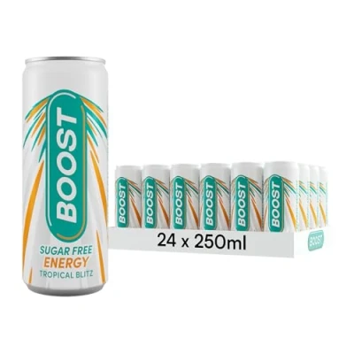 TROPICAL FLAVOUR SUGAR FREE ENERGY DRINK 24 PACK - Enjoy a full-flavoured, energising kick with this Boost Energy Original Sugar Free Cans 24 Pack! Our energising sugar free soft drinks transports your tastebuds to blue skies and Tropical climates without any sugar. Treat your tastebuds and experience Boost in every part of your day with this powerful productivity drink! MAX PERFORMANCE CAN DRINKS 24 PACK BULK - Get the energy you need to make life happen with our energy drink. Infused with 70mg caffeine per 250ml to help keep you going for longer, increase alertness and reduce feelings of tiredness. These canned drinks also include Taurine, vitamin B12, and vitamin B6 for an extra burst of vitality. INVIGORATING FIZZY CANS 24 PACK - Tackle your everyday tasks with a whole new level of stimulation and experience the energy to take on life's challenges head on with these chilled drinks. Our crates of energy drink get you owning early mornings in the office, pushing through lunchtime dates with extra barbell plates and dominating your late-night gaming sessions. SUPERCHARGED ENERGY DRINK CANS FOR ALL - Get the ultimate recharge exactly when you need it with our low calorie (3 kcals per 100ml), vegan and vegetarian friendly and gluten free sugar free drinks 24 pack! Perfect for priming your mind and body first thing in the morning or just after lunch when a sustained energy release is needed more than ever! UK-BASED ZERO SUGAR ENERGY DRINKS 24 PACK - We make multi pack drinks that taste great, cost less and give you the Boost you need to own your day. Since 2001, our mission has been creating great-tasting functional cases of fizzy drinks at a price our customers can't get enough of. And, if we say so ourselves, we do it better than anyone else.