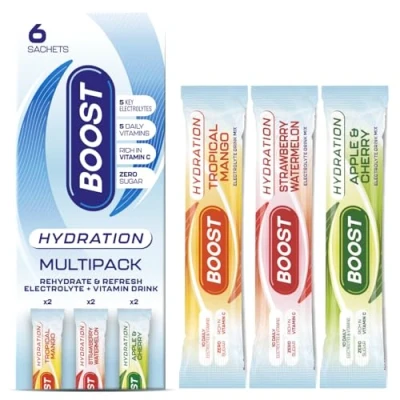 Boost Hydration Electrolytes Powder 6X Pack Sugar Free Sachets 2X of Each Flavour Tropical Mango, Strawberry Watermelon and Apple Cherry with Vitamins Multipack