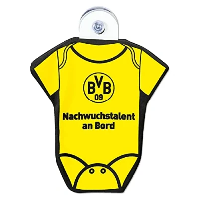Cute BVB car window hanger in the shape of a baby bodysuit With a length of 16.5 cm and a width of 14 cm Made of 100% Polyester Includes suction cup for attaching to window panes With BVB logo and the inscription "Nachwuchstalent an Bord"