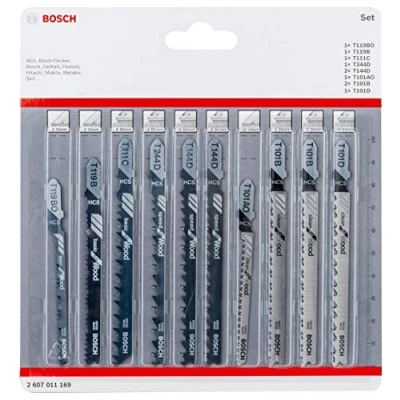 10 pieces. Jigsaw blade set with 1 x T 119 BO/T 119 B/T 111 C/T 244 D/T 101 AO/T 101 D and 2 x T 144 D/T 101 B Basic for Wood: T 119 BO for fine curve cuts in softwood (2-15 mm), T 199 B for straight fine cuts in softwood (2-15 mm), T 111 C for straight coarse cuts in softwood (4-50 mm) Speed for Wood: T 244 D for coarse curve cuts in softwood (5-50 mm), T 144 D for straight, coarse cuts in softwood (5-50 mm) Clean for Wood: T 101 AO for fine curve cuts in softwood (1.5-15 mm), T 101 B for straight, fine cuts in softwood (3-30 mm), T101 D for straight, fine cuts in softwood (10-45 mm) Compatible with T-shank jigsaws from Bosch and other manufacturers, Weight: 0.16314207388 Pounds, Manufacturer: Bosch