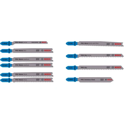Features: Designed for cutting metal, stainless steel, and aluminium Long Life cutting metal and aluminium Fits all T-shank jigsaws Are you a metalworker who needs a set of long-lasting jigsaw blades for a variety of applications? Use jigsaw blades in the PRO Metal and Alu Set to get straight and curved cuts in metal, stainless steel, and aluminium – time and again. The PRO Metal and Alu Set includes durable jigsaw blades made from high-speed steel (HSS) and Bi-Metal: an HSS tooth strip bonded with a high-carbon steel (HCS) body for strength and durability. The blades have different shapes and tooth geometries to ensure you can tackle various metalworking applications with ease. What's in the box: PRO Metal curve T 118 EOF (1x) PRO Metal thin T 121 GFC (1x) PRO Metal medium T 121 AFC (2x) PRO Metal thick T 121 BFC (2x) PRO Metal thick and thin T 123 XF (1x) PRO Alu curve T 227 D (1x) PRO Alu T 127 D (1x) PRO Stainless Steel T 118 GFS (1x)
