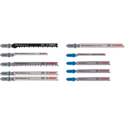 Features: Designed for cutting wood and metal Long Life cutting wood and metal Fits all T-shank jigsaws Are you a professional who needs a set of long-lasting jigsaw blades for wood and metal applications? Use jigsaw blades in the PRO Wood and Metal Set for fast, straight cuts and curved, clean, precise cuts in wood as well as straight and curved cuts in metal. The PRO Wood and Metal Set includes jigsaw blades made from Bi-Metal: they have a high-speed steel (HSS) tooth strip bonded with a high-carbon steel (HCS) body for strength and durability. Blades T121GFC, T121AFC, and T121BFC have an additional AlTiN coating ensuring even higher resistance to wear. The blades have different shapes and tooth geometries to ensure you can tackle various woodworking and metalworking applications with ease. What's in the box: PRO Wood precise T 144 DP (1x) PRO Hardwood clean curve T 101 AOF (1x) PRO Hardwood fast T 144 DF (1x) PRO Hardwood clean T 101 BF (2x) PRO Hardwood clean rev.T 101 BRF (1x)