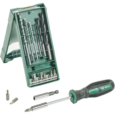 Features: 3 high-grade, durable drill bits for versatile applications in wood and in masonry. 8 screwdriver bits for the most important screw head types and sizes for quick and easy screwdriving and mounting. Magnetic universal holder for fast bit changes and a reliable screw hold in the bit. Including an extra hand screwdriver. Safety note: Please wear appropriate protective clothing based on the application: Wood drilling: Protective goggles and dust mask Masonry drilling: Protective goggles, dust mask, hearing protection and work gloves What's in the box: 15-pcs Mini-X-Line mixed set (2607019579)