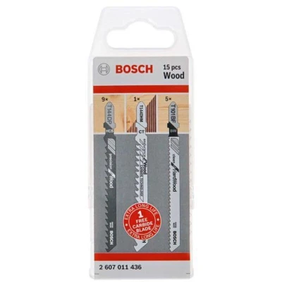 General description 15 Piece Bosch Wood Jigsaw Blade Set designed for various applications in wooden materials. Includes a range of blades specialized for different wood applications, ensuring versatility and efficiency. Technical specifications Contains: 9 x T 144 DP Precision for Wood 5 x T 101 BF Clean for Hardwood 1 x T 144 DHM EXPERT Hardwood Fast Compatibility and accessories Compatible with all kinds of jigsaws. Usage Ideal for cutting various types of wood, including hardwood and precision wood applications. Other information Compact design allows for convenient storage in a toolbox, providing organized access and safe transport.