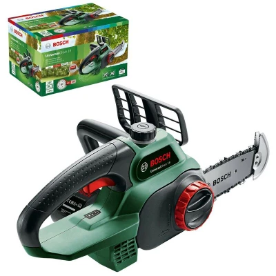 General description Lightweight, compact, and maneuverable, the Bosch 18V Cordless Chainsaw is designed for effective pruning in various positions, weighing just 3 kg (including battery). It features a stabilizing tip protector with gripping teeth that securely grips the wood, ensuring a clean undercut while minimizing branch damage. The chainsaw is equipped with the Syneon Chip for extended battery run time and offers versatility for delicate pruning, waste management, and firewood preparation. Technical specifications Weight: 3 kg (including battery) Bar length: 20 cm (200 mm) Battery: Compatible with all 18 V Home & Garden tools Usage Easy to operate SDS system for fast assembly, chain tensioning, and maintenance Reduced risk of kickback for safer operation Pivoted trigger mechanism, fixed felling hand guard, and softgrip handle for enhanced control, safety, and comfort Tethered oil cap and viewing window for easy refilling On-board battery status indicator with LED system to show
