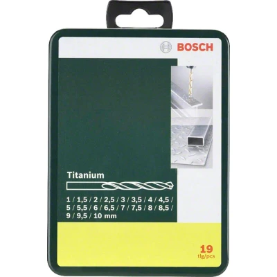 This 19 Piece Bosch Metal HSS Titanium Drill Bit Set. Suitable for alloyed and non-alloyed steel up to a tensile strength of 900 N/mm². Malleable cast iron, sintered iron, new silver, copper, bronze and hard plastics such as perspex. Supplied in a metal organiser box. Contains the following sizes: 1, 1.5, 2, 2.5, 3, 3.5, 4, 4.5, 5, 5.5, 6, 6.5, 7, 7.5, 8, 8.5, 9, 9.5,10mm.