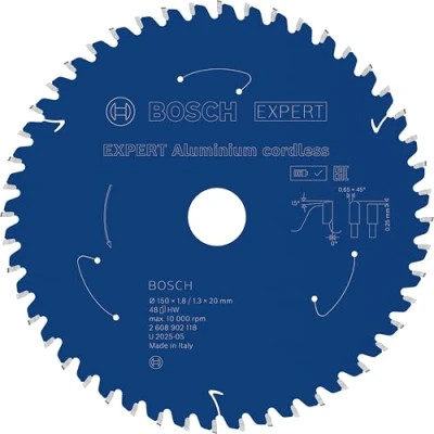 AmazonDesigned for cutting aluminium Exceptional durability is built in with Bosch Carbide Technology Bore works with or without reduction rings to fit different sizes Ideal for cutting aluminium, eg wide aluminium profiles Scope of delivery: EXPERT Aluminium cordless Circular Saw Blade, 150 x 1.8/1.3 x 20 mm, T48, Weight: 0.36596735492 Pounds, Manufacturer: Bosch