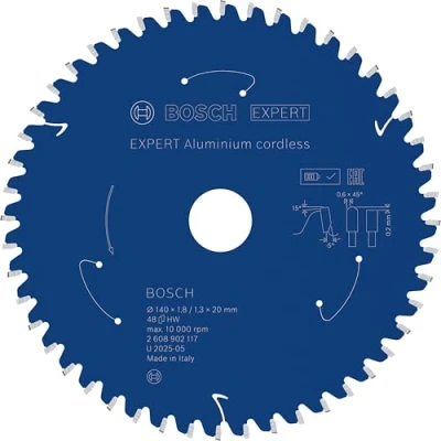 AmazonDesigned for cutting aluminium Exceptional durability is built in with Bosch Carbide Technology Bore works with or without reduction rings to fit different sizes Ideal for cutting aluminium, eg wide aluminium profiles Scope of delivery: EXPERT Aluminium cordless Circular Saw Blade, 140 x 1.8/1.3 x 20 mm, T48, Weight: 0.3196702799 Pounds, Manufacturer: Bosch