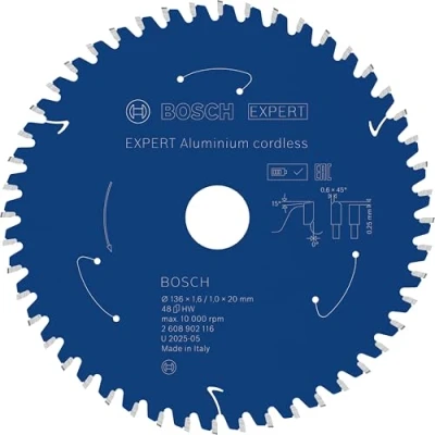 AmazonDesigned for cutting aluminium Exceptional durability is built in with Bosch Carbide Technology Bore works with or without reduction rings to fit different sizes Ideal for cutting aluminium, eg wide aluminium profiles Scope of delivery: EXPERT Aluminium cordless Circular Saw Blade, 136 x 1.6/1 x 20 mm, T48, Weight: 0.2314853751 Pounds, Manufacturer: Bosch