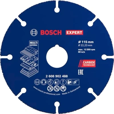 Carbide Technology for Long Life Cutting Multi Materials Exceptional durability is built in with Bosch Carbide Technology With 22.23 mm bore for standard locking nut angle grinders Ideal for cutting multiple materials with an angle grinder. Cuts wood and embedded screws and nails; plastic pipes; and makes accurate cut-outs in tough panels such as laminates and drywall Scope of delivery: EXPERT Carbide Multi Wheel Cutting Disc 115 mm, 22.23 mm, Manufacturer: Bosch