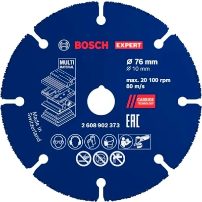 Carbide Technology for Long Life Cutting Multi Materials Exceptional durability is built in with Bosch Carbide Technology With 10 mm bore for mini grinder Ideal for cutting multiple materials with an angle grinder. Cuts wood and embedded screws and nails; plastic pipes; and makes accurate cut-outs in tough panels such as laminates and drywall Scope of delivery: EXPERT Carbide Multi Wheel Cutting Disc 76 mm, 10 mm, Weight: 0.89066753848 pounds, Manufacturer: Bosch