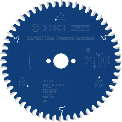AmazonDesigned for cutting high pressure laminate Exceptional durability is built in with Bosch Carbide Technology Bore works with or without reduction rings to fit different sizes Ideal for cutting high pressure laminate materials, eg façade boards, flooring boards, and cladding panels Scope of delivery: EXPERT High Pressure Laminate Circular Saw Blade, 160 x 1.8/1.2 x 20 mm, T52, Weight: 0.3858089585 Pounds, Manufacturer: Bosch