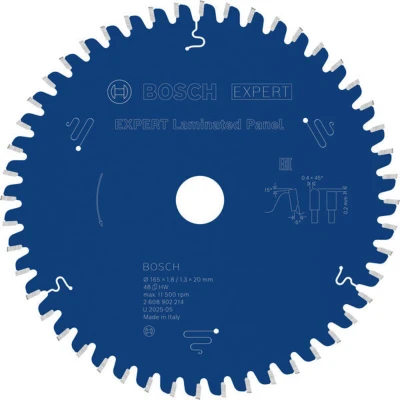 Features: Designed for cutting laminated panel Long Life cutting laminated panel Exceptional durability is built into accessories with Bosch Carbide Technology. It combines hard and robust tungsten carbide grains with our own advanced manufacturing techniques. Extra coating for increased performance and durability. The coating reduces friction and protects the circular saw blade from heat and corrosion. Bore works with or without reduction rings to fit different sizes When you cut laminated panels for kitchen cabinets or worktops you want to make sure that the cuts are clean and precise so that every detail of the new cabinet or worktop looks perfect. We designed the EXPERT Laminated Panel for handheld circular saws to make sure you get a circular saw blade that helps you get the job done. The EXPERT Laminated Panel is a circular saw blade designed for the jobs you need to get done with a handheld circular saw. It will help you cut through laminated panels – effectively, time and