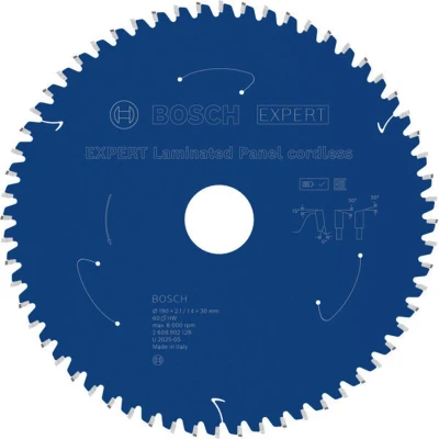 Features: Designed for cutting laminated panel Long Life cutting laminated panel Exceptional durability is built into accessories with Bosch Carbide Technology. It combines hard and robust tungsten carbide grains with our own advanced manufacturing techniques. Extra coating for increased performance and durability. The coating reduces friction and protects the circular saw blade from heat and corrosion. Bore works with or without reduction rings to fit different sizes When you cut laminated panels for kitchen cabinets or worktops you want to make sure that the cuts are clean and precise so that every detail of the new cabinet or worktop looks perfect. We designed the EXPERT Laminated Panel cordless for handheld circular saws to make sure you get a circular saw blade that helps you get the job done – while your tool’s battery lasts. The EXPERT Laminated Panel cordless is a circular saw blade designed for the jobs you need to get done with a cordless handheld circular saw. It will