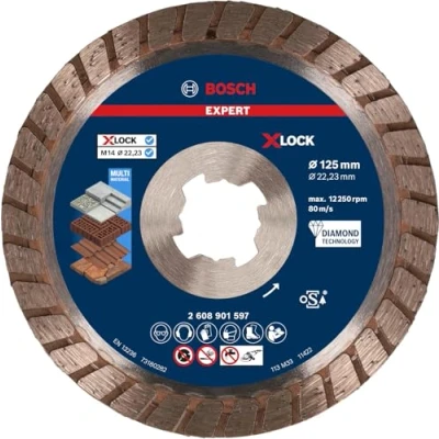 AmazonLasts up to 2x longer than Bosch Eco for Universal Cutting Disc Exceptionally durable cutting edge using Bosch Diamond Technology With 22.23 mm bore for standard locking nut angle grinders Ideal for cutting various materials, such as concrete, bricks, soft stone, and roof tiles, eg when cutting stone paving slabs and masonry materials Scope of delivery: Bosch EXPERT MultiMaterial X-LOCK Diamond Cutting Disc 125 x 22.23 x 2.4 x 12 mm, Weight: 0.3527396192 Pounds, Manufacturer: Bosch