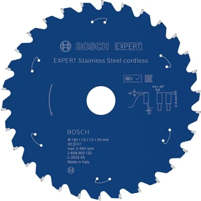 AmazonDesigned for cutting stainless steel Exceptional durability is built in with Bosch Carbide Technology Bore works with or without reduction rings to fit different sizes Ideal for cutting stainless steel, eg stainless steel sheet, eg when fitting industrial kitchens Scope of delivery: EXPERT Stainless Steel cordless Circular Saw Blade, 140 x 1.5/1.2 x 20 mm, T30, Weight: 0.28219169536 pounds, Manufacturer: Bosch