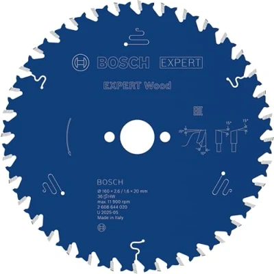 Lasts up to 2x longer than an Eco for Wood Circular Saw Blade Exceptional durability is built in with Bosch Carbide Technology Bore works with or without reduction rings to fit different sizes Ideal for cutting all types of wood and composite wood, eg beams, boards, plates, laths, and any other wooden workpieces you need to cut on the jobsite Scope of delivery: EXPERT Wood Circular Saw Blade, 160 x 2.6/1.6 x 20 mm, T36, Weight: 0.49163084426 pounds, Manufacturer: Bosch