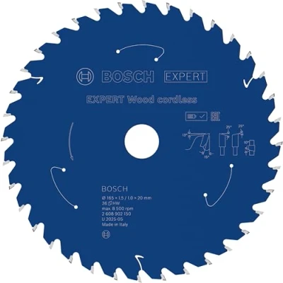 AmazonLasts up to 2x longer than an Eco for Wood Circular Saw Blade Exceptional durability is built in with Bosch Carbide Technology Bore works with or without reduction rings to fit different sizes Ideal for cutting all types of wood and composite wood, eg beams, boards, plates, laths, roof battens, and any other wooden workpieces you need to cut on the construction site Scope of delivery: EXPERT Wood cordless Circular Saw Blade, 165 x 1.5/1 x 20 mm, T36, Weight: 0.33730726086 Pounds, Manufacturer: Bosch
