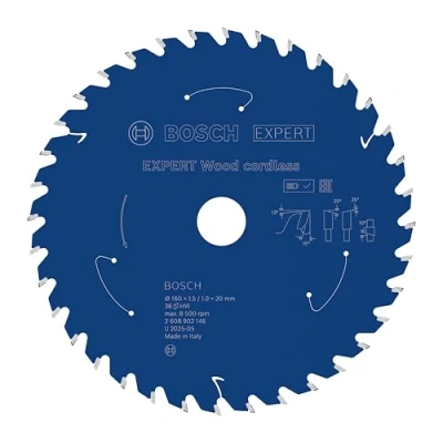 Lasts up to 2x longer than an Eco for Wood Circular Saw Blade Exceptional durability is built in with Bosch Carbide Technology Bore works with or without reduction rings to fit different sizes Ideal for cutting all types of wood and composite wood, eg beams, boards, plates, laths, roof battens, and any other wooden workpieces you need to cut on the construction site Scope of delivery: EXPERT Wood cordless Circular Saw Blade, 160 x 1.5/1 x 20 mm, T36, Weight: 0.31746565728 pounds, Manufacturer: Bosch
