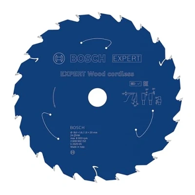AmazonLasts up to 2x longer than an Eco for Wood Circular Saw Blade Exceptional durability is built in with Bosch Carbide Technology Bore works with or without reduction rings to fit different sizes Ideal for cutting all types of wood and composite wood, eg beams, boards, plates, laths, roof battens, and any other wooden workpieces you need to cut on the construction site Scope of delivery: EXPERT Wood cordless Circular Saw Blade, 184 x 1.6/1 x 20 mm, T24, Weight: 0.42328754304 Pounds, Manufacturer: Bosch