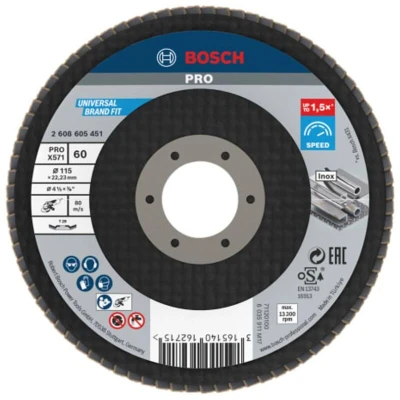 Bosch 1x PRO Metal X571 Flap Disc Angled Version Fiber for Small Angle Grinders (for steel, Stainless Ø 115 mm, Grit 60, Professional Accessory Grinder)