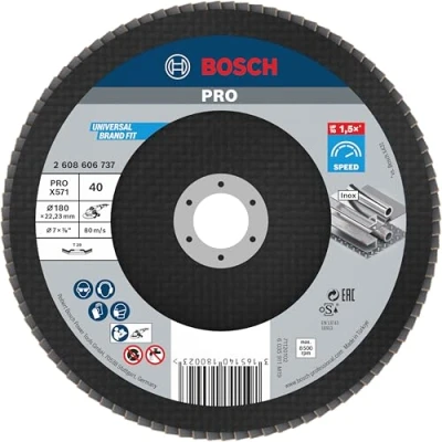 Up to 1.5x faster than a Bosch X431 Flap Disc Highly efficient for metalworkers: Speed With 22.23 mm bore for standard locking nut angle grinders For grinding metal, eg when removing welds and stock on mild steel and stainless steel Scope of delivery: Bosch PRO X571 Flap Disc, 180 mm, G40, Manufacturer: Bosch