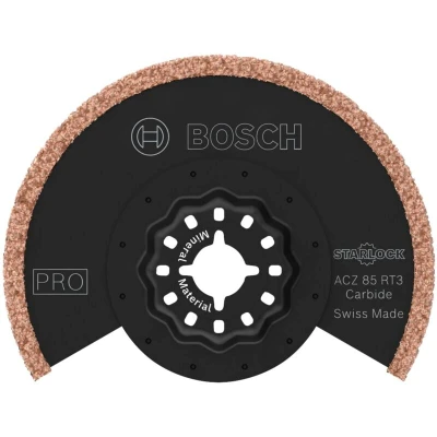 General description The Bosch PRO ACZ 85 RT3 Multitool Blade is designed for durability and effectiveness in abrasive materials. It is ideal for removing old grout without damaging surrounding tiles and can also cut cable channels in aerated concrete. Technical specifications Diameter: 85 mm Cutting Width: 2.5 mm Installation Starlock mount for optimum power transfer. Convenient blade change within 3 seconds. 3-dimensional tight-fitting connection between machine and accessory for maximum power transfer.