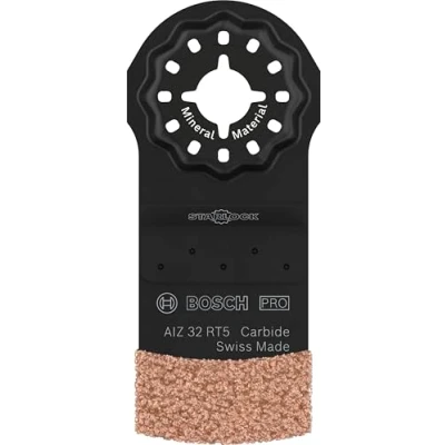 Designed to do the work of 2 blades Highly efficient for tilers: 2-in-1 Starlock mount for optimum power transfer and convenient blade change within 3 seconds For efficiently removing broken tiles, eg to replace a single broken tile in a bathroom or kitchen wall; cuts out tile grout and sands away old mortar Scope of delivery: Bosch PRO AIZ 32 RT5 Multitool Blade, 2.5 x 32 mm, Weight: 36.0 grams, Manufacturer: Bosch