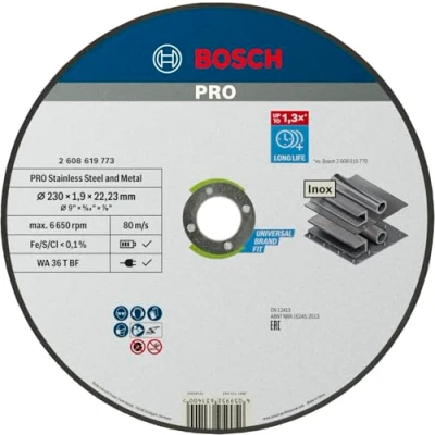 Lasts up to 1.3x longer than a Bosch Standard for Metal Disc (2608619769) Highly efficient for metalworkers: Long Life With 22.23 mm bore for standard locking nut angle grinders For cutting stainless steel and metal in general metalworking applications Scope of delivery: Bosch PRO Stainless Steel and Metal Cutting Disc, 230 x 1.9 x 22.23 mm, Manufacturer: Bosch