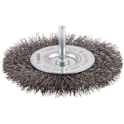 General description The Bosch 1609200273 100X0.3MM Pencil Brush features a 6mm shank and is designed for light to medium duty cleaning tasks on small to medium metal surfaces. It is effective for removing coatings, rust, cleaning formwork boards and facings, roughing, matt sanding, and paint stripping. Technical specifications Arbor Hole Diameter: 6mm Bristle Material: Steel Wire Bristle Type: Crimped Wire Brush Diameter: 100mm Brush Type: Cup Brush MFR Part No.: 1609200273 Max rpm: 4500rpm Mounting Type: Shank Shaft Diameter: 6mm Wire Diameter: 0.3mm Other information