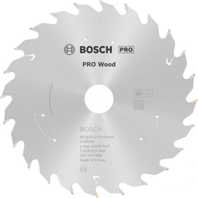 Features: Lasts up to 1.3x longer than a Bosch Eco for Wood Circular Saw Blade Long Life cutting wood The extra-thin kerf ensures precise cuts and a long battery lifetime. The thin blade works with less friction, extending your cordless power tool’s battery runtime. Expansion slots reduce noise and heat build-up to ensure a longer lifetime Ground and sharpened fine carbide teeth for strength, durability and precision. Made using high-quality carbide grains, the teeth are individually shaped for top performance. Bore works with or without reduction rings to fit different sizes Running out of battery when cutting wood with your cordless saw? Try the PRO Wood cordless. We made its kerf extra thin so that it consumes less power. The blade’s carbide teeth ensure it will cut all types of solid wood and wood-based panel materials – while your battery lasts. We made the PRO Wood cordless Circular Saw Blade for woodworkers who use cordless saws to cut all types of solid wood and